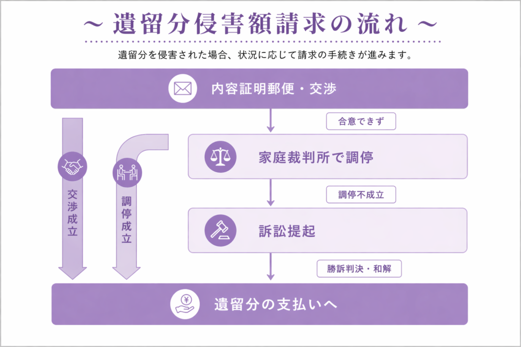 この前、遺留分の話を聞いたけど、もし私の取り分が侵害されてたら、どうやって請求すればいいの?